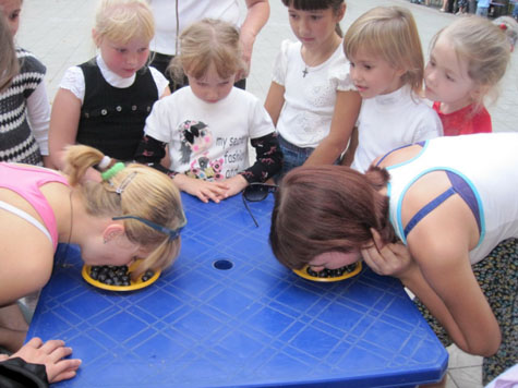 Судя по некоторым деталям одежды, странным образом питающиеся участники праздника гораздо старше зрителей. Тогда, может быть, детям тоже хочется того, что поедают у них на глазах взрослые, в рамках «формирования семейных ценностей и традиций», а им не дают?! Но нет, как сообщается в заметке, все участники праздника, числом в 12 человек, были награждены сладкими призами.