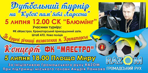 … Я уверен, что 5 июля, в День освобождения Краматорска от боевиков, в городе будет хороший праздник. И, кроме концерта победительницы «Евровидения 2016» Джамалы, на стадионе СК «Блюминг» состоится не менее ожидаемый футбольный турнир «Кубок памяти Ларсона» с участием звезд из ФК «Маэстро», которые затем выступят с концертом на центральной площади города.