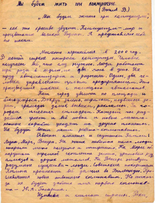 Пожелтевший листок бумаги, знакомый с детства почерк. Сочинение "Мы будем жить при коммунизме", автор - Выголов В. Но - не я.