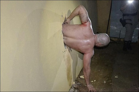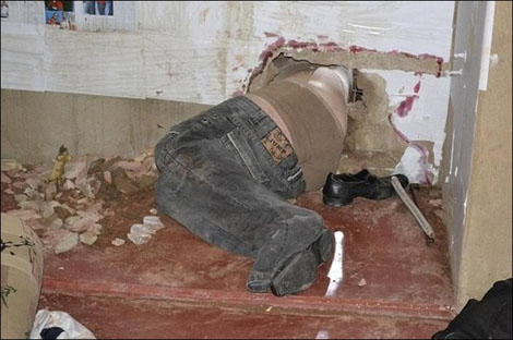 План побега был продуман до мелочей, однако закончился полным провалом. Трое заключенных за несколько дней потихоньку пробили дыру в стене камеры. Первым в отверстие полез самый упитанный. И... застрял на полпути к свободе. Его большой живот никак не хотел пролезать сквозь узкую брешь в стене. В таком виде его и застали охранники, когда сам заключенный-неудачник стал звать кого-нибудь на помощь...