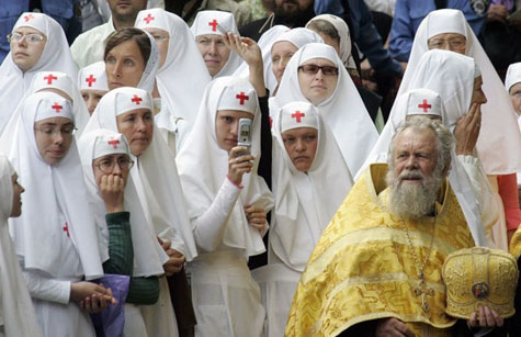 Киев, 2008 год. Православные медсестры и священник во время службы, которую проводили патриарх Русской православной церкви Алексий II и константинопольский патриарх Варфоломей.