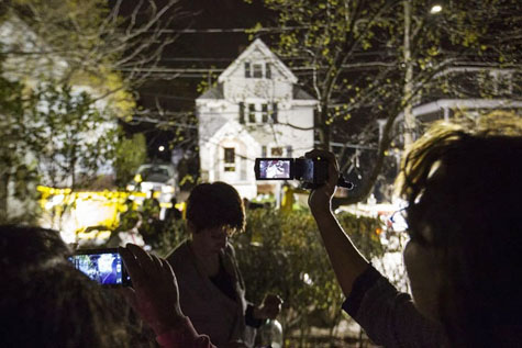 Апрель 2013. Бостон, США. Жители соседних домов снимают двор, в котором, в лодке, был обнаружен и задержан Джохар Царнаев, обвиняемый в организации взрывов на бостонском марафоне.