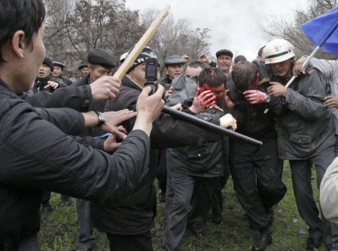 Апрель 2010. Киргизские протестующие избивают полицейских в Бишкеке во время штурма здания правительства.