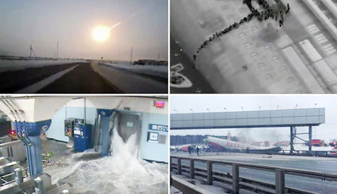 Это новейшие из «кадров, которые впечатлили мир», четыре примера из многих (слева направо, построчно): челябинский болид, снятый видеорегистратором, высадка пассажиров с опрокидывающейся «Коста-Конкродии», снятая в темноте в ИК-диапазоне, потоп на станции метро в Нью-Джерси во время урагана «Сэнди» — съемка камеры наблюдения и, наконец, катастрофа Ту-204 во «Внуково» — съемка очевидца.