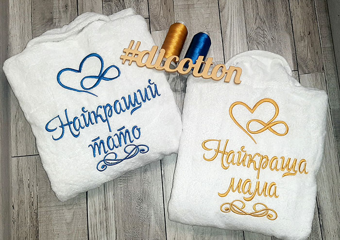 Вы можете быть уверены в качестве изделий Dicotton. Надписи на халате изготавливаются с помощью специального аппарата, который работает с точностью и не оставляет каких-либо дефектов. Халаты, выбранные нами для нанесения надписей, сделаны из турецкой махры, в составе которой 100% хлопок, а также плюша и велюра. Для вышивки мы используем немецкие нитки высокой прочности.