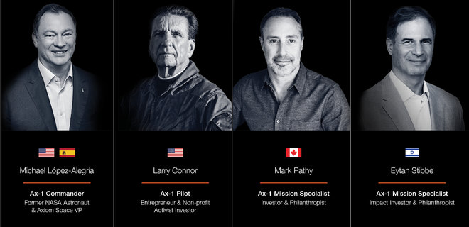 Американская частная компания Axiom Space назвала имена трех космических туристов, которые отправятся на Международную космическую станцию (МКС). Список и фото опубликованы на сайте Axiom Space.