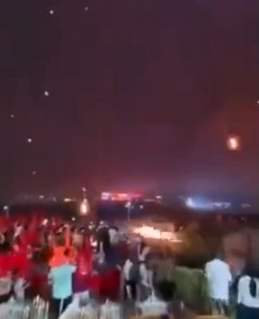 Очевидці повідомляють, що вогняні уламки сипалися просто на натовп, створюючи хаотичну паніку. На відео з місця події видно, як люди намагаються сховатися від палаючих дронів, що падали з неба.