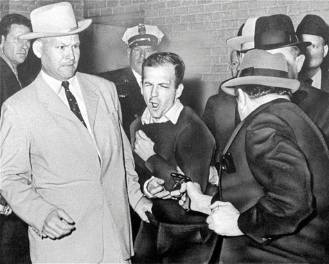 24 ноября в Далласе, снова в прямом эфире, во время перемещения Ли Харви Освальда под конвоем на встречу с прессой (сегодня трудно представить, чтобы задержанный по подозрению в убийстве тут же давал пресс-конференцию) происходит еще одно убийство — уже самого подозреваемого в убийстве. Узкий коридор отделения полиции, много людей, Дэн Разер уже тут — стоит с микрофоном, Освальд появляется в сопровождении агентов в черных костюмах и шляпах и уже начинает делать заявление для прессы, как раздается выстрел: хаос, агенты набрасываются на падающее тело Освальда. И снова Америка наблюдает за происходящим в прямом эфире. К камере, которая, по всей видимости, и передавала телесигнал, подбегают репортеры других компаний и, тесня друг друга, наперебой рассказывают в нее о случившемся своим аудиториям. Представьте современный стэндап, только в кадре целая очередь и каждый пытается вылезти на первый план.