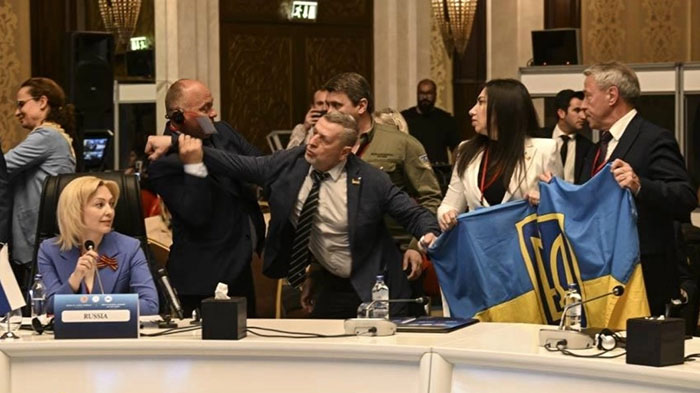 Депутати Верховної Ради спробували зірвати виступ російської делегації на саміті Парламентської асамблеї Чорноморського економічного співробітництва (ПАЧЕС) в Анкарі. Згодом у кулуарах між українським депутатом та представником країни-агресорки сталася бійка через прапор України.