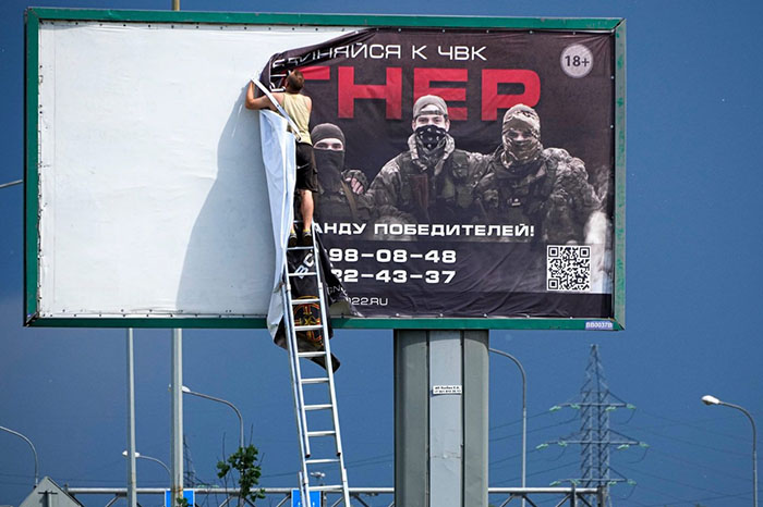 На фото: Після початку заколоту в містах Росії почали прибирати банери, які закликають стати найманцем ПВК Вагнера. Санкт-Петербург, 24 червня 2023 року. AP / Scanpix / LETA
