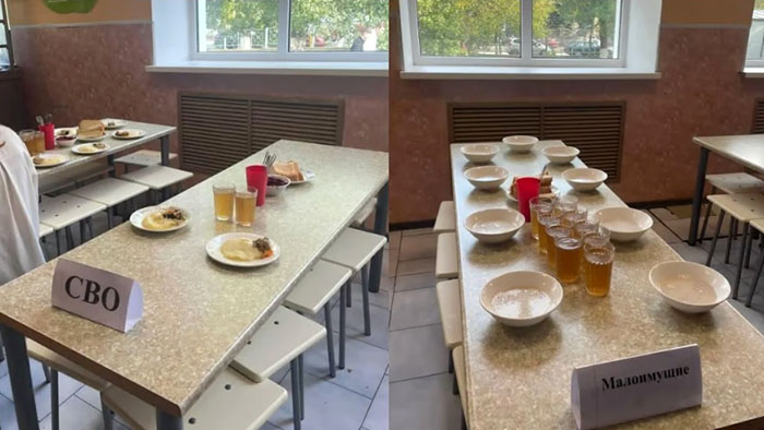 «У декількох школах Азова (Ростовська область рф) в їдальнях розмістили таблички, що визначають столи для дітей з малозабезпечених сімей і сервіровані для дітей »учасників СВО«», повідомляють місцеві Телеграм-канали