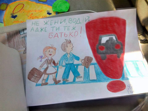 Дети нарисовали плакаты по тематике соблюдения Правил дорожного движения и вместе с работниками патрульной полиции дарили их водителям авто- и мототранспорту. "Не жени, водiй! Ти теж батько!" - было написано на детских плакатах.