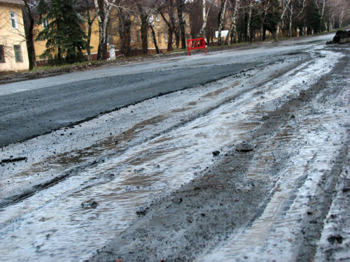 Для того, чтобы понять, в каких именно погодных условиях выполнялась эта работа, достаточно высунуть нос на улицу: сплошными ручьями и потоками хлещут талые и дождевые воды. Именно в них закатывали на улице Дружбы тонны и тонны асфальта.