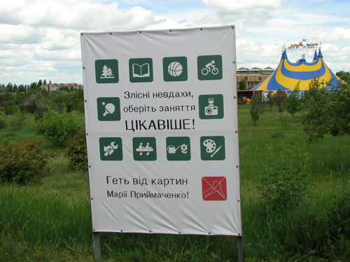 В районе центральной городской библиотеки Краматорска появился стенд, взывающий к совести местных вандалов, которые регулярно курочат изображения работ знаменитой украинской художницы Марии Приймаченко.
