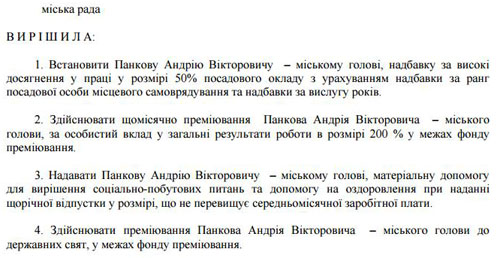 Напомним: депутаты решили, что с 1 января 2017 года городскому голове Андрею Панкову будут выплачиваться надбавки за высокие достижения в труде в размере 50% должностного оклада с учетом надбавки за ранг должностного лица местного самоуправления и надбавки за выслугу лет. Кроме того, городской голова будет ежемесячно премироваться "за личный вклад в общие результаты работы" в размере 400% в пределах фонда премирования. Ранее это было всего 100 процентов.