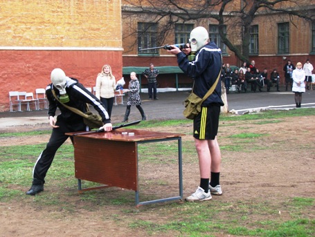 В школе отрабатывали действия на случай хлорной атаки, точнее – аварии на фильтровальной станции, которая расположена на улице Юбилейной. И хотя на открытии Дня гражданской защиты представители городского управления МЧС дружно пожелали ребятам, чтобы в жизни им никогда не приходилось применять полученные знания на практике, знать – значит, уметь. А лишние знания никогда не помешают.