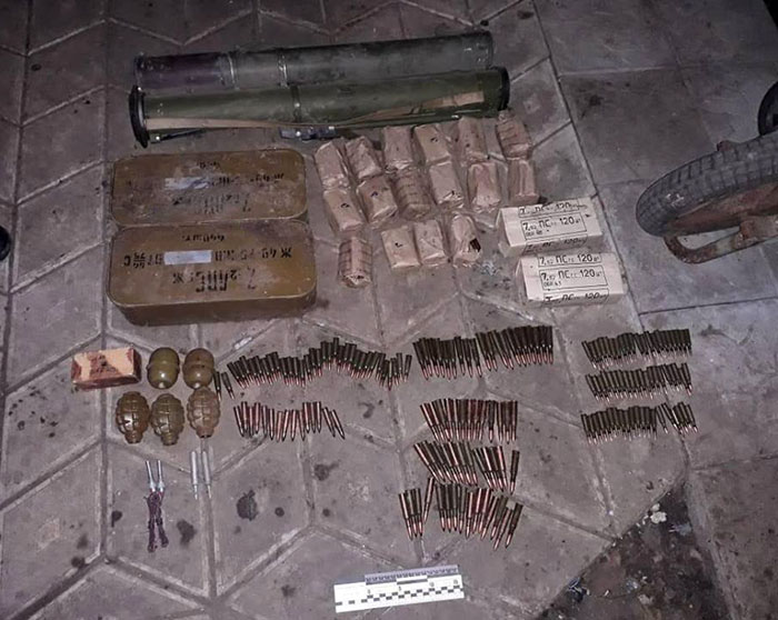 Сотрудники СБУ и Нацполиции изъяли у него 1600 патронов разного калибра, две гранаты РГД-5, три гранаты Ф-1, два ручных противотанковых гранатомета РПГ-26 и РПГ-22 и тротиловую шашку весом 400 граммов.