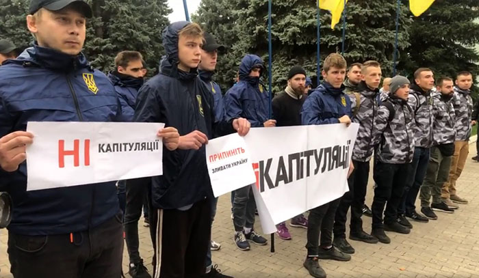 Сегодня, 25 октября, в Краматорске, у здания Донецкой областной государственной администрации, прошла акция "Нет капитуляции", в которой приняли участие несколько десятков представителей Национального корпуса и Национальных дружин.