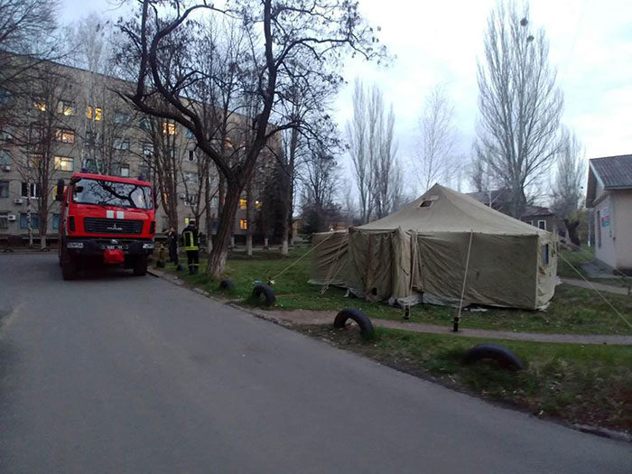 "Во исполнение распоряжения Министра охраны здоровья Украины- руководителя работ по ликвидации последствий медико-биологической чрезвычайной ситуации природного характера государственного уровня, связанной с распространением коронавирусной инфекции COVID-19 Виктора Ляшко от 29.03.2020 г. № 9 (...), Главным управлением ГСЧС Украины в Донецкой области на территории учреждений охраны здоровья, предназначенных для госпитализации пациентов с коронавирусной инфекцией (,,,) на террритории Донецкой области обустроено 12 временных пунктов прием а и сортировки возможных больных (пневмокаркасные модули и палатки УСБ-56".