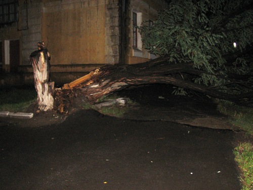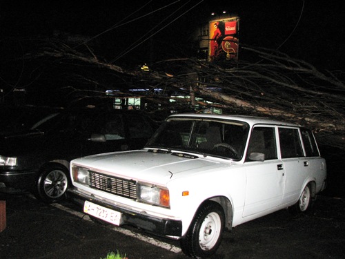 Из-за ветра упали сразу два тополя в самом центре Краматорска, в районе гостиницы «Краматорск», в связи с чем временно было прервано движение электротранспорта. Одно из деревьев угодило на припаркованные автомобили.