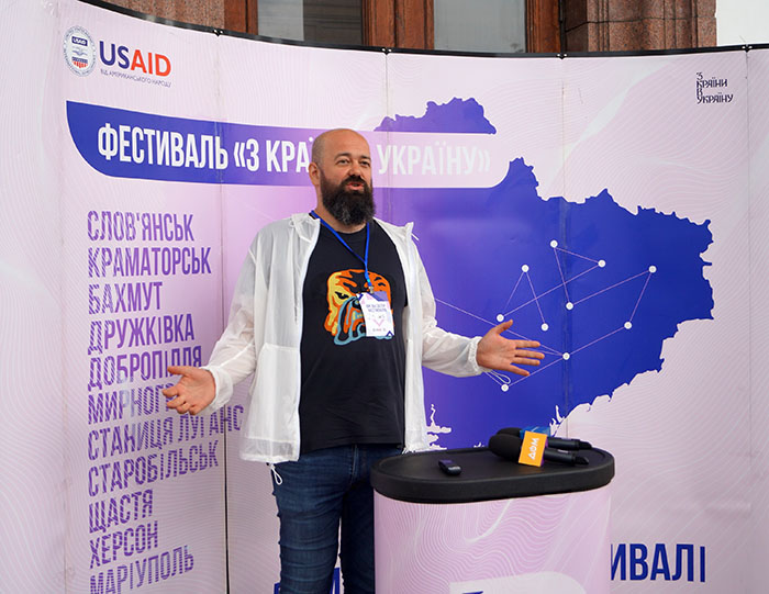 "Мы очень рады, что удалось найти формат, которые обеспечивает соблюдение все противоэпидемических норм, - заявил на открытии глава правления Фундации социальных инноваций «З країни в Україну» и идейный вдохновитель фестиваля Денис Блощинский (на фото). - В этом году с нами - десятки партнеров из всех уголков Украины, и жители Краматорска могут приобщиться к спецпроектам, как, например, как съемка клипов для 11 городов, и другим.