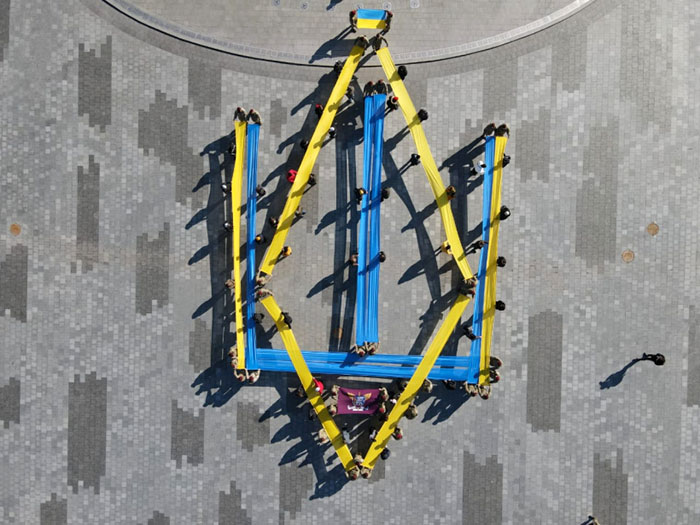 Малий герб України розміром 16×12 метрів за допомогою синіх та жовтих полотен створили військовослужбовці 81-ї аеромобільної бригади, яка з листопада 2014 року боронить країну від російського окупанта. Допомагали військовим 60 небайдужих громадян.