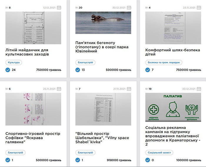 В Краматорске открыто голосование за проекты по программе «Общественный бюджет-2022», на что город планирует потратить 3,4 млн гривень. В этом году на рассмотрение Координационного совета поступили 23 предложения, 15 февраля из них отобрали 6 как наиболее перспективные и, по логике, действительно нужные городу. Утверждалось также, что предпочтение будет отдано проектам, ориентированным на развитие пригородных поселков и развитие мест общественного отдыха на природе.