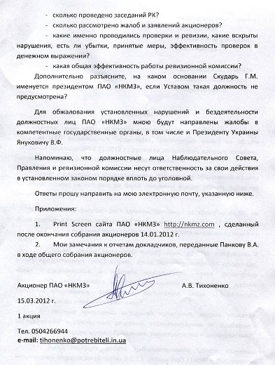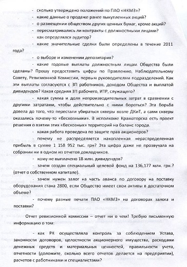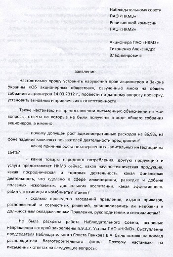 Все свои замечания Тихоненко изложил в письменном виде и передал Виктору Панкову в надежде на то, что он озвучит их, но он этого не сделал. На следующий день акционер написал заявления в наблюдательный совет и ревизионную комиссию, чтобы они разъяснили, почему допущен рост административных расходов на 86,9%, на фоне падения ключевых показателей деятельности предприятия, почему не раскрыта работа наблюдательного совета, каков размер дохода первых руководителей НКМЗ, а также дали ответы на другие вопросы.