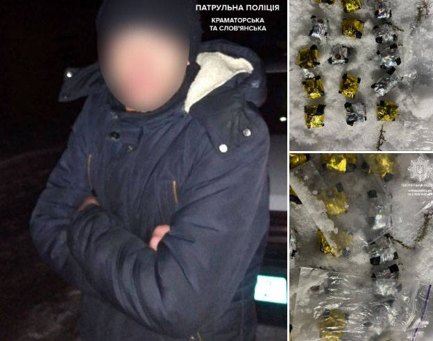 Потім, обстеживши територію поблизу гаражів, патрульні помітили сліди, які вели трохи далі. Прослідувавши, біля цеглини вони побачили 18 згортків перемотаних чорною ізолентою та 2 прозорих зіп-пакети з речовиною білого кольору, схожою на наркотичну.