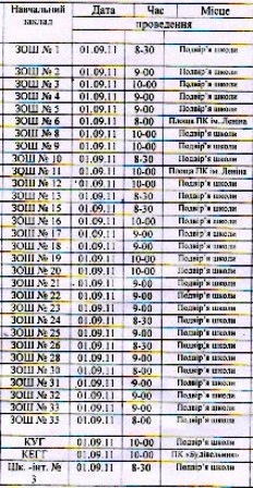 По информации городского Управления образования, часть школ обратилась к местным властям с просьбой скорректировать время проведения линеек из-за того, что в 10 часов утра будет уже жарко, и стоять битый час под палящим солнцем – дело опасное. В горУО пошли навстречу, и сегодня в прессу были переданы скорректированные графики проведения линеек в честь 1-го сентября. Итак, смотрим.