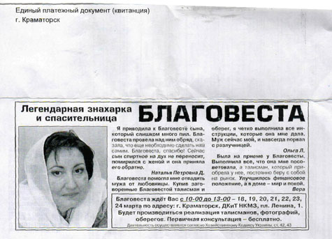 На квитанциях было размещено большое, в четверть листа, объявление об услугах некой «Легендарной знахарки и спасительницы Благовесты». Между прочим, размеры этого объявления косвенно позволяют судить о доходах всех этих знахарок, гадалок и целительниц: по расценкам СЕЗ, реклама Благовесты «тянет» примерно на 12.000 гривен, но это так, к слову. А скандал получился из-за того, что в наших, исторически православных, краях, необходимость лицезреть, да еще и хранить 3 года лик Благовесты многими верующими была расценена как оскорбление. Люди стали по телефону на повышенных тонах жаловаться в абонслужбу СЕЗ и в газеты. А те, кто знахарей, гадалок и прочих провидцев не приемлет в принципе, вынуждены были потратиться на… копирование квитанций, и платить по ксерокопиям, дабы потом хранить дома документ, не оскорбляющий их религиозные чувства.