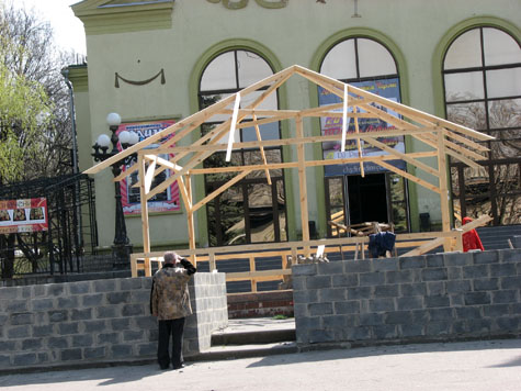 На фонтане у кинотеатра "Родина" развернулось какое-то строительство. Проход к фонтану со стороны самой площади уже ограничен грубыми шлакоблочными кирпичами. А над самим фонтаном нынче высится каркас деревянного сооружения, напоминающего некий теремок. Работа кипит вовсю.
