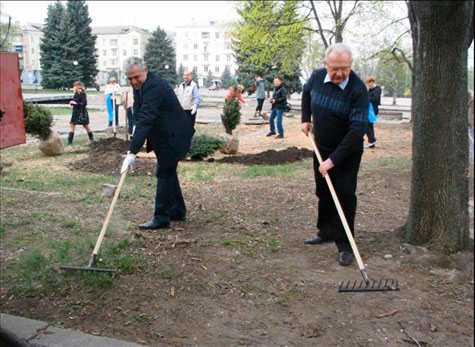 Вместе с работниками горисполкома Краматорска, в центре города садили деревья и убирали мусор сразу два народных депутата Верховной Рады Украины: Анатолий Близнюк и Юрий Боярский.