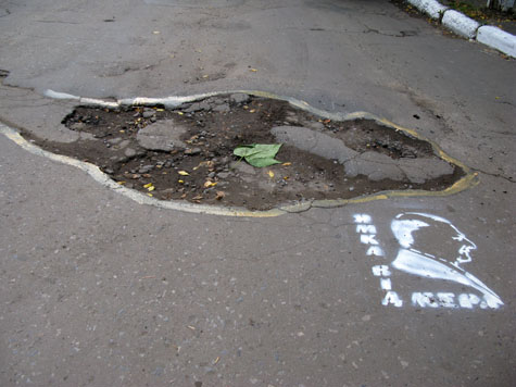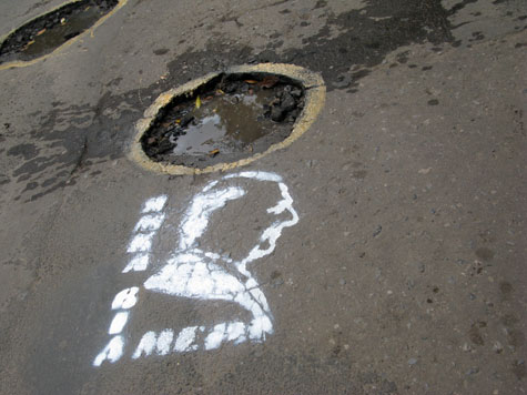 На дорогах Краматорска стали появляться забавные художества: ямы и ямища обводятся желтым контуром, а рядышком белеет до боли знакомый профиль. Прилагающаяся надпись не оставляет места для сомнений: "Ямка вiд мера".