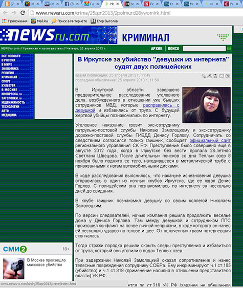 «Если кто помнит, в разгар избирательной компании здесь было два "фейсбук-активиста" за Боярского, некто Ирина Самко и Игорь Федоринов, - сообщает издание со ссылкой на информацию пользователя "Фейсбука" Алексея Михненко. - Оказывается - "Игорь Федоринов" - это следователь из Подмосковья, а "Ирина Самко" - зверски убитая девушка из Иркутской области. Вот такие дела», - пишет Алексей.