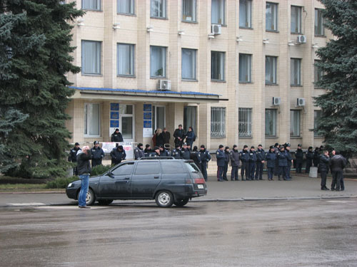 Прямо сейчас центр Краматорска и здание горисполкома представляют собой странное зрелище: практически пустая площадь, а вокруг здания органа власти стоит плотное кольцо из числа сотрудников местного горотдела милиции.