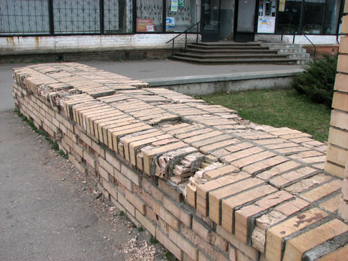 Речь, прежде всего, идет о двух арках высотой в несколько метров каждая. Они, как и декоративное обрамление Сквера, были сложены из светлого облицовочного кирпича в конце 90-х годов. К сожалению, материал оказался недолговечным, и сегодня кирпич активно крошится не только на горизонтальных поверхностях, но и внутри арок, под которыми ходят люди. Бетон отстал от кирпичей, и, судя по всему, если не предпринять срочных мер по разборке, дело может закончиться плохо.