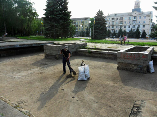 Житель Краматорска Илья Андреев провел в течение нескольких последних дней любопытный трудовой эксперимент: своими силами и личным инвентарем почистил емкости бывших фонтанов в самом центре города, которые превратились в последнее время в мусоросборники.