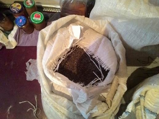 Во время обыска у наркодельца изъяли уксус, растворитель и пять мешков макового сырья общим весом более 120 килограмм. Также изъято пол литра готового к употреблению наркотика.