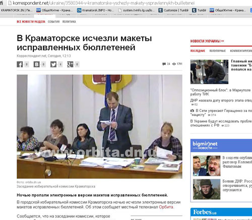 Сегодня авторитетное Интернет-издание "Корреспондент" опубликовало заметку о событиях, связанных с печатанием в Краматорске избирательных бюллетеней для Красноармейска. "В городской избирательной комиссии Краматорска ночью исчезли электронные версии макетов исправленных бюллетеней", - утверждает издание со ссылкой на "местный телеканал "Орбита".