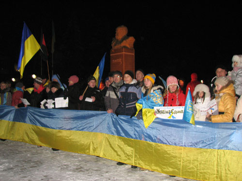Участники собрались у памятника Шевченко, а затем, с 40-метровым полотнищем национального флага в руках, прошли на центральную площадь города, где их поджидала контурная карта страны.