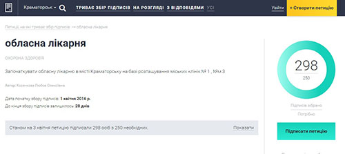 Автором петиции выступила 1 апреля краматорчанка Любовь Косенкова, и созданное ею обращение уже побило все рекорды по скорости сбора подписей: по состоянию на 22 часа 3 апреля, петиция собрала 298 подписей при минимально требуемых 250. Теперь петиция становится обязательной для рассмотрения властями Краматорска.