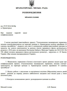 Согласно тексту документа, финансовому управлению поручено подготовить проект соответствующего решения городского совета о софинансировании проекта «Усовершенствование пассажирских перевозок городским электротранспортом на территории Краматорска путем приобретения 10 единиц троллейбусов ".