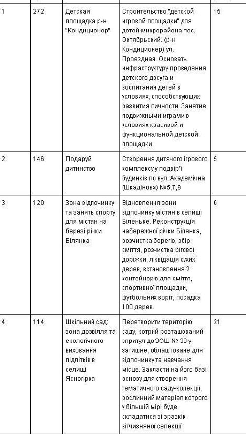 Проекты были рассмотрены комиссией и структурными подразделениями Краматорского городского совета с целью определения технической возможности их реализации. По итогам этой проверки, в голосовании принял участие лишь 21 проект.