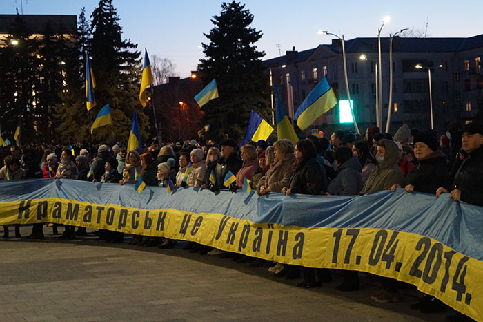 Вечером 23 февраля на центральной площади города прошла патриотическая акция "Краматорськ - це Україна!". В центр города с желто-голубыми флагами в руках пришли сотни и сотни людей.