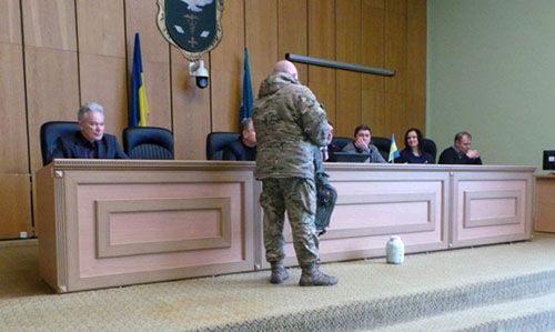 Дикую выходку в здании городского совета Славянска устроил сегодня, 19 декабря, общественный активист Василия Хоменко, который принес с собой и поставил в зале заседаний обернутую фольгой 3-литровую банку с надписью "Ртуть".
