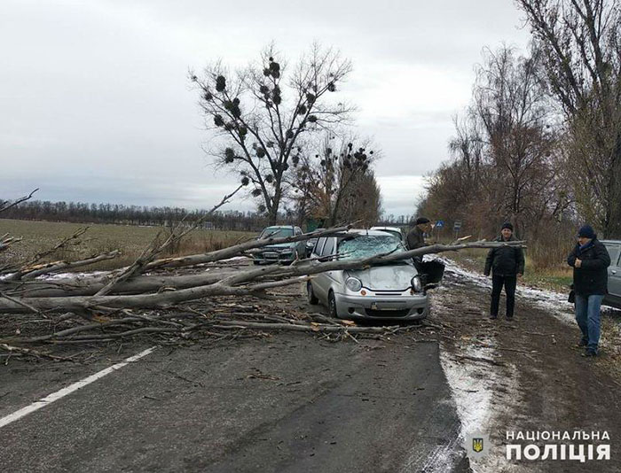 Около полудня 16 ноября в Славянском районе из-за погодных условий едва не погиб 75-летний мужчина. На его «Daewoo Matiz», который свернул с харьковской трассы и направлялся в сторону Святогорская, упало дерево.