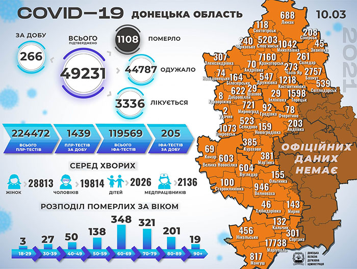 Кроме того, за среду, 10 марта, лаборатории сообщили о еще 266 больных, среди которых 7 детей. "Лидеры" - Мариуполь (133), Краматорск (23), Бахмут (17), Славянск (15).