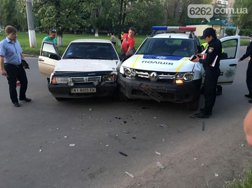 Во вторник, 24 мая, в Славянске на перекрестке улиц Г.Батюка и Ясной произошло столкновение автомобиля ВАЗ, в котором находился водитель и двое детей, и служебного автомобиля патрульных полицейских.