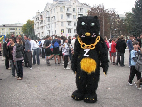 Периметр площади постепенно занимается торговцами, разворачиваются детские батуты, на сцене возятся с техникой звукооператоры, а среди празднующих горожан бродит диковинный мохнатый зверь.